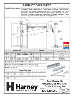 Product Data Specification Sheet Of A Commercial Door Closer, UL Fire Rated, ANSI 1, ADA Compliant, SP 1-6 - Aluminum Finish - Product Number DC8300AL